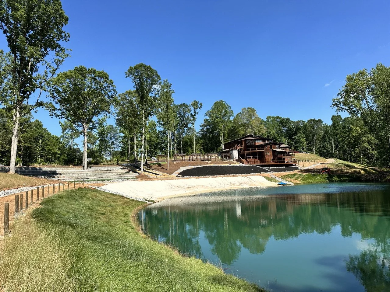 Located between Greenville and Spartanburg (about 25 minutes to each), the property sits on 67 private acres with a lake, forest trails, and a historic water wheel.